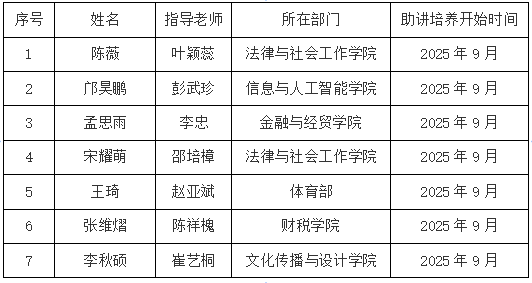 为有效帮助青年教师尽快掌握教学规律、胜任教学岗位,建设一支具有较高教学水平的青年教师队伍,全面提升我院教学质量,根据《浙江财经大学东方学院青年教师助讲培养制度实施办法(试行)》(浙财大东教〔2022〕65号)文件及《关于2025-2026学年青年教师助讲培养工作安排的通知》(浙财大东教〔2025〕76号)文件,经过个人申请、二级学院(部门)审核,教务管理部审批通过陈薇等7人进入我院青年教师助讲培养项目,现公布如下: