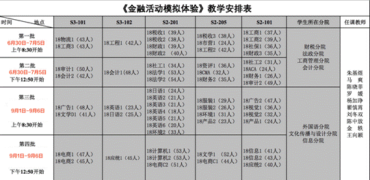 2018级《金融活动模拟体验》课程教学将分两期(共4批)进行,第一期第(1-2批)上课时间为2019年6月30日—7月5日,第二期(第3-4批)上课时间为2019年9月1日-9月6日。具体教学安排详见下表所示: