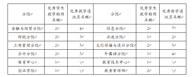 分院学生数超过1000人可推荐2名学生教学助理,其余分院及中心各推荐1名学生教学助理。优秀教学通讯员按各分院学生班级数(不包含2015级)的15%推荐。名额详见下表: